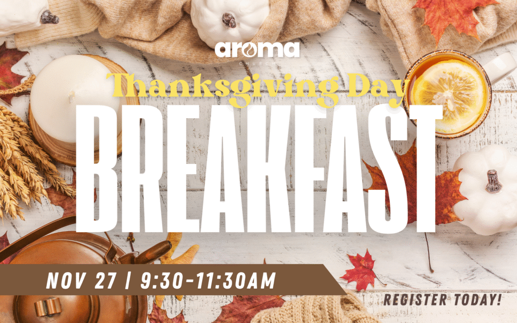 Join us for our Thanksgiving Breakfast on Thursday, November 27th, from 9:30 to 11:30am. We invite you to a morning of gratitude, fellowship, and reflection as we celebrate. Come enjoy a delicious breakfast and meaningful time with our Aroma family as we give thanks.