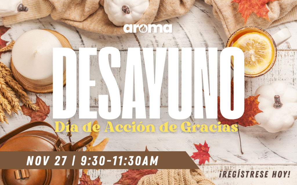 Únase a nosotros para nuestro Desayuno de Acción de Gracias el jueves 27 de noviembre, de 9:30 a 11:30 a.m. Los invitamos a una mañana de gratitud, compañerismo y reflexión mientras celebramos. Venga a disfrutar de un delicioso desayuno y un tiempo significativo con nuestra familia Aroma mientras damos gracias.